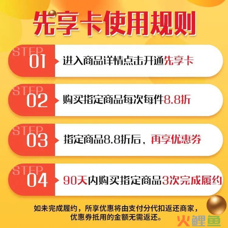 先享卡的推出实际上是跟用户做了一次约定,领取先享卡是免费的,但是领取后的90天内用户需要购买带“先享价”标签商品3次才可以。如果达不到3次怎么办呢?会微信自动扣除享受到的优惠,然后返还给商家,这就是支付分的作用。