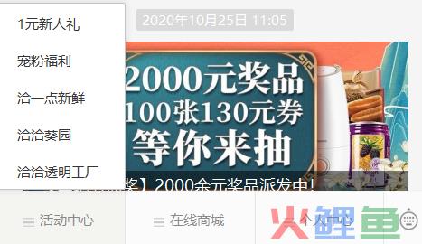 洽洽食品在公众号设置了三个菜单栏,非常有意思。分别是【活动中心】、【在线商城】和【个人中心】。