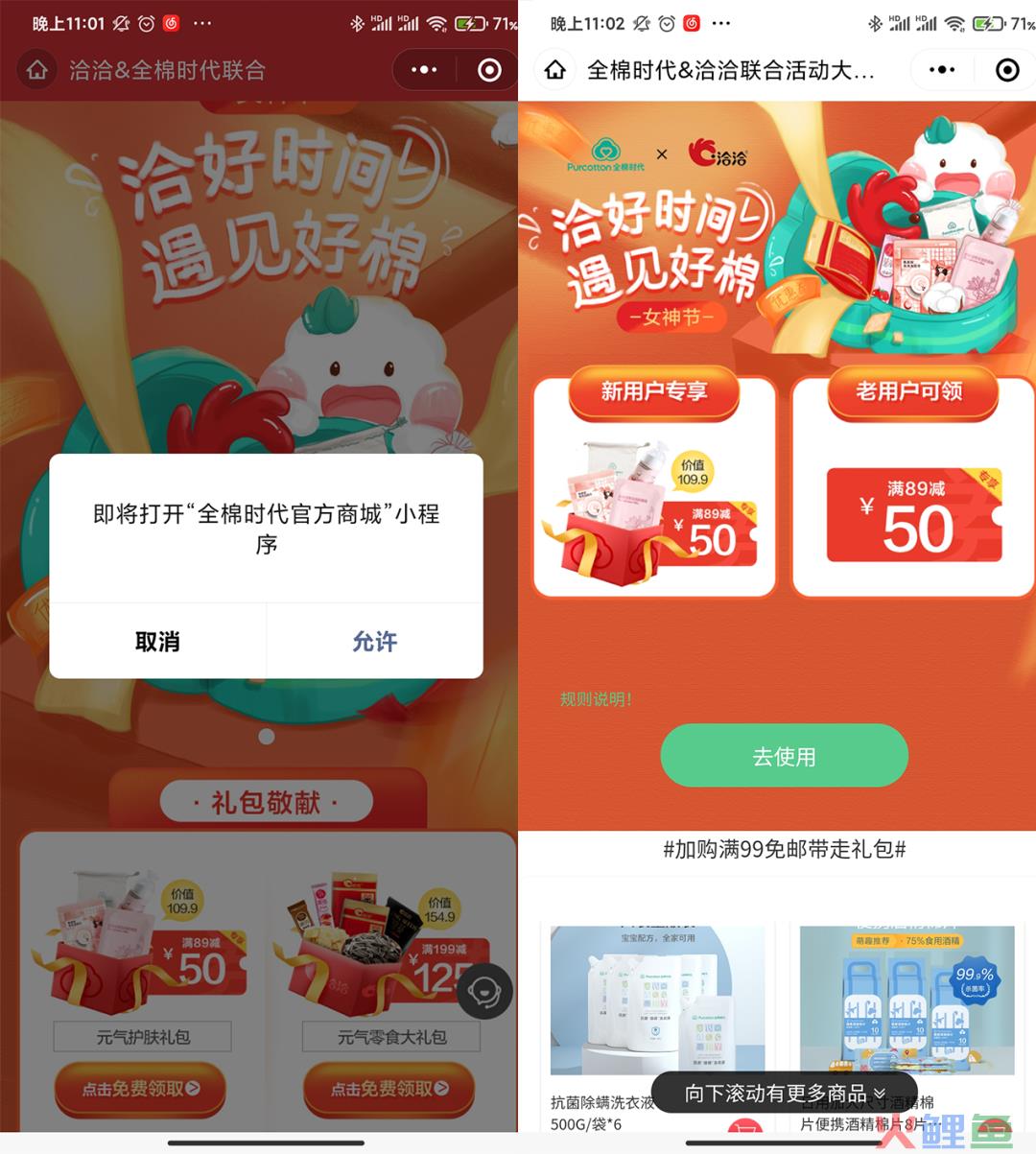 是在三八女神节之际上线的活动,点击礼包会直接跳转到全棉时代的官方商城活动页面中,可以领取89-50元的大额优惠券,再次击中用户占便宜的心理。
