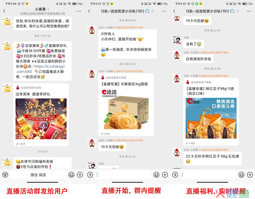 另外在直播活动开展之前,洽洽食品会提前将直播小程序在社群内进行展示,提前做好活动的预热。开播前3个小时会通过企业微信能力把直播活动群发给用户;直播开始后,在群内进行提醒;直播中的秒杀福利运营人员还会实时转发到社群内。