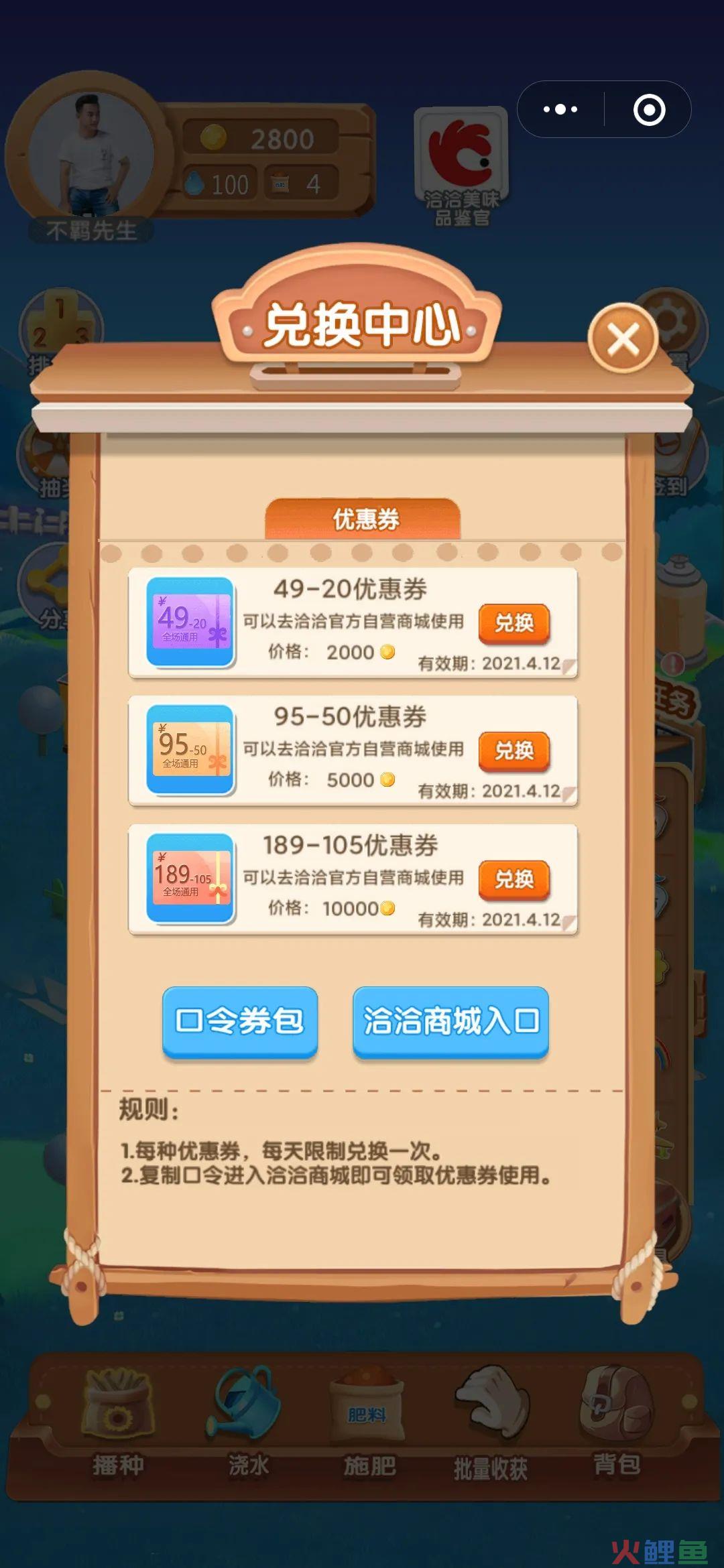 播下的种子成熟后,再通过背包里的材料煮熟,最后制作成熟瓜子,就可以卖出啦,卖出后得到相对应的积分。积分可以到兑换中心兑换大额优惠券,优惠券有49-20优惠券、95-50优惠券、189-105优惠券,对用户来说也是相当大的诱惑了。
