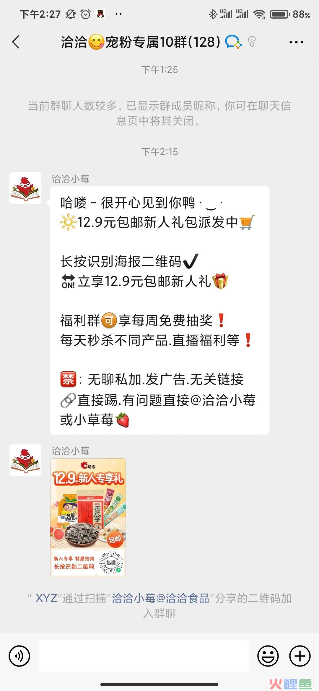 进入福利社群后,人设“洽洽小莓”发送欢迎语文案+新人专享礼。文案中表明福利群的作用,每周有免费的抽奖、每天可以秒杀不同的产品以及直播福利(直播带货)。