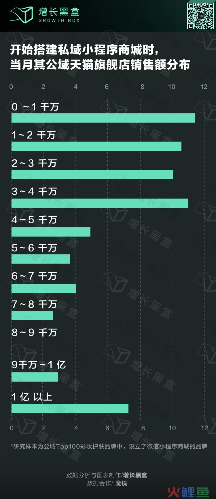 那么,品牌方会选择在什么规模的时候开始建立私域呢?观察这些品牌建立私域小程序商城的当月天猫旗舰店的销售额,可以发现,品牌大多在月销售额达到4千万之前就会选择建立私域商城。