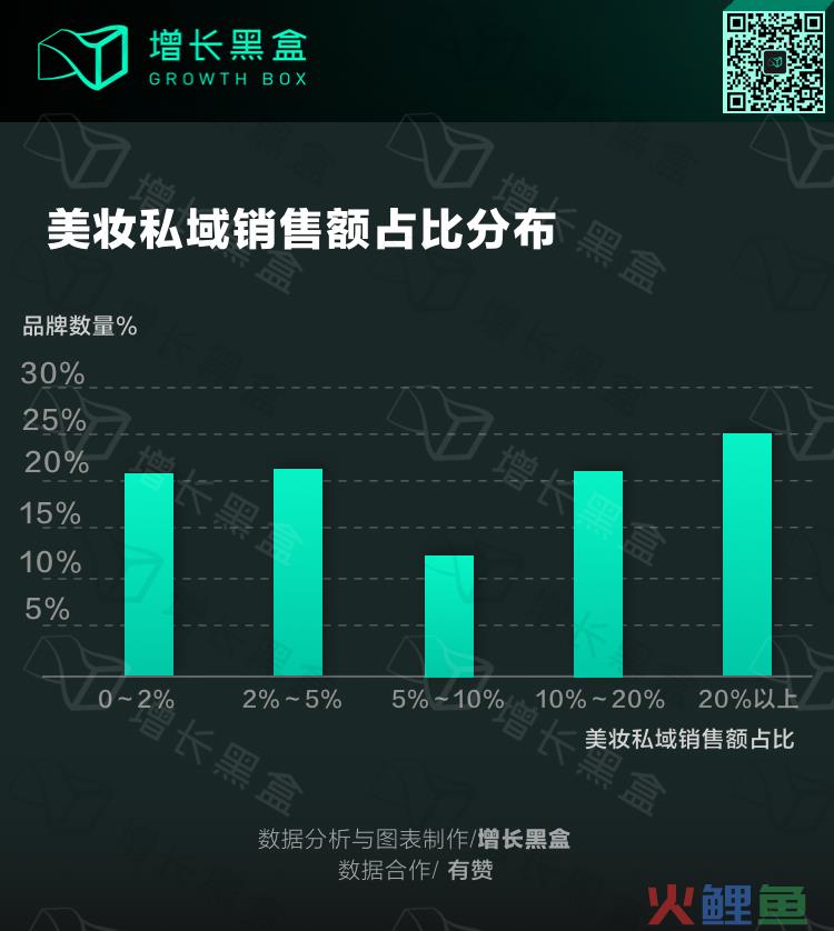 我们选取了有赞销量top的近30家美妆品牌,作为本次研究中的样本,计算了其私域销售额的占比(近1年)。我们发现,75%的样本品牌私域销售额占比在20%以下 - 也就意味着绝大多数目标品牌的私域销售额占比不到1/5。