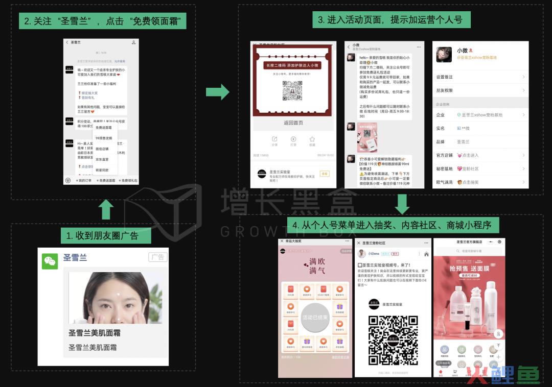 圣雪兰的私域链路是典型的公众号与个人号结合的例子。用户在朋友圈看到圣雪兰投放的广告后,会跳转关注公众号。用户点击菜单中的“免费领面霜”,会提示添加运营的微信个人号。用户添加好友后,可以通过运营的个人企业微信号菜单进入抽奖、内容社区、商城小程序等。运营也可以定期通过私聊向用户发送促销信息,在内容社区、朋友圈与用户互动。