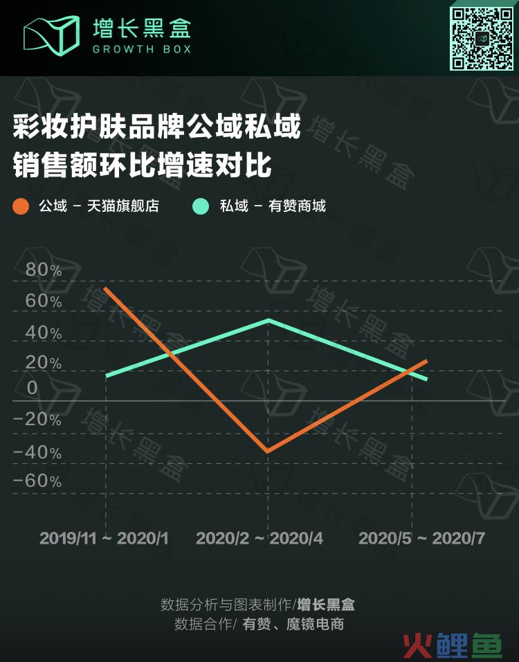 我们对比了近30家目标品牌在过去一段时间的环比增长,可以发现,在2019年末,受双十一影响,公域的增长率远高于私域。而到了今年年初疫情到来之际,因双十一效应过去,公域的销售额环比呈负增长,而随着品牌对私域的重视,私域销售额增长迅速。