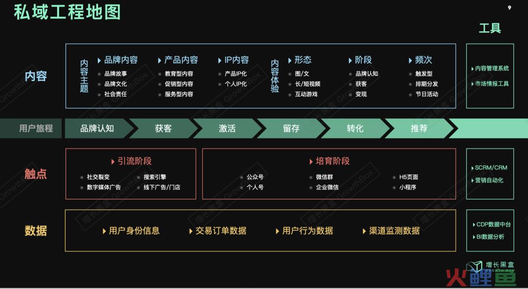 私域的建设是系统性工程,是从地基开始一步步构建起摩天大厦的。因此,必须对于私域的整个流程和方法进行深入的研究,建立起结构化的“私域蓝图”,明确每个环节所需要的人才、工具、策略。