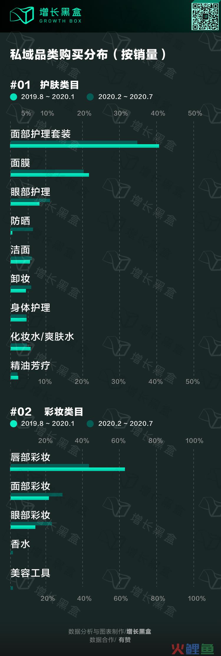 而从品类来看,“面部护理套装”和“面膜”是私域内销量最好的两大护肤类目,而“唇部彩妆”、“面部彩妆”、“眼部彩妆”依次是私域内销量最高的彩妆类目。另外,不难看出,疫情对于消费者品类选择的影响。疫情(2020.2月~7月)时间段内,眼部护理、眼部彩妆、面部彩妆比例相较疫情之前都有所上升,而唇部彩妆比例则有所下降。