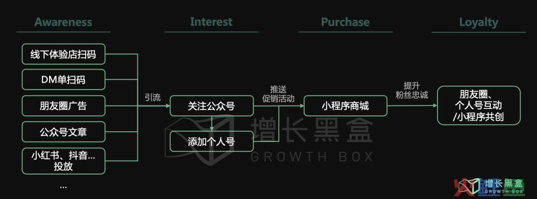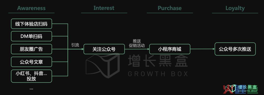 公众号版链路是三种私域链路中最基础、最简洁的一种。这一私域运营链路主要围绕公众号展开用户培育,上承多种渠道获客,下接小程序商城转化。