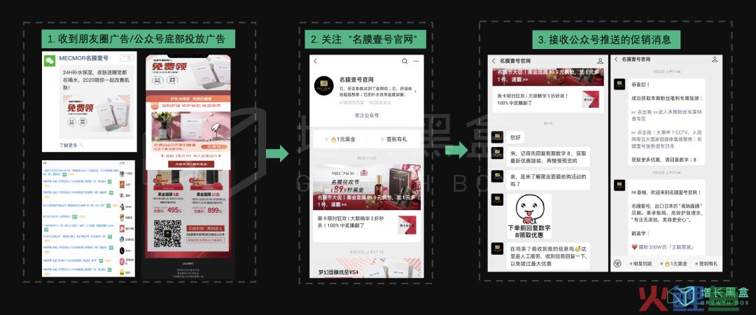 名膜壹号采用了典型的公众号型私域链路。用户收到品牌在朋友圈或公众号文章中投放的广告后,会跳转关注其公众号“名膜壹号官网”,之后将不断接受公众号推送的各种促销信息。