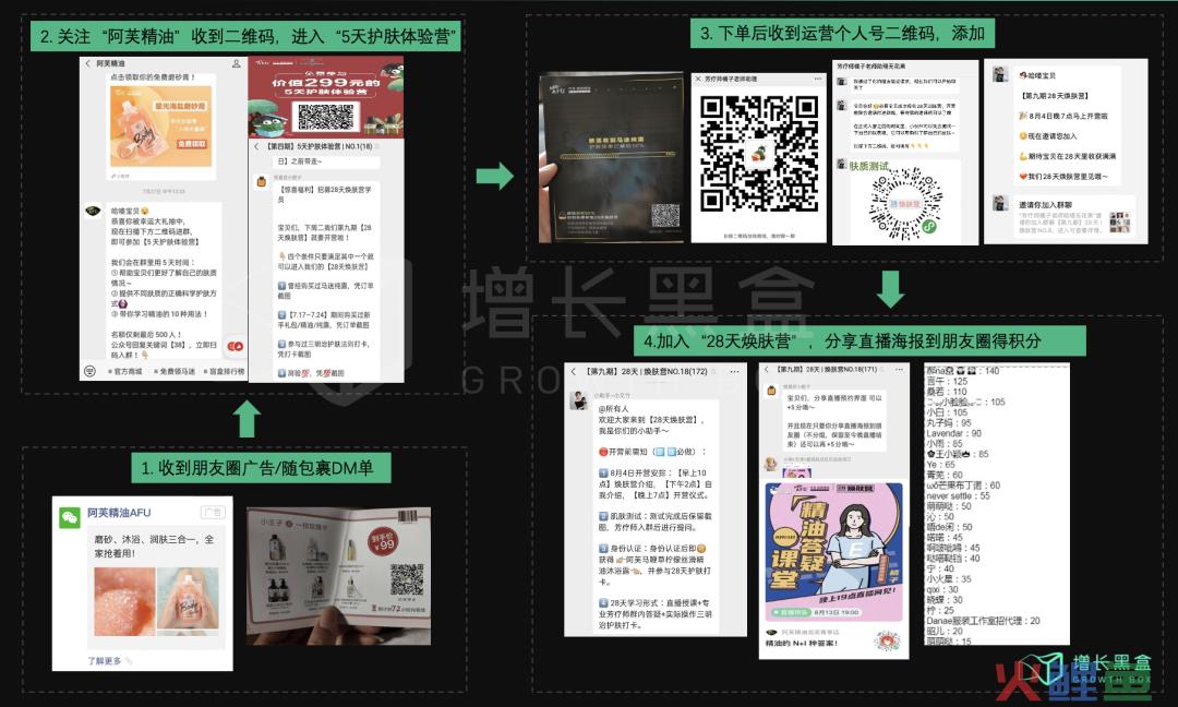 阿芙精油是采用这一私域链路的典型美妆品牌。据不完全统计,阿芙的社群矩阵目前包含“5天体验营”、“28天焕肤营”、“车厘子直播间”、“阿芙股东芙利社”等。用户通过朋友圈广告、快递DM单扫码进群后,会收到“5天护肤体验营”的进群二维码,加入后即可接收品牌方精心准备的各类科普、营销、互动内容。5天结束后,下单的用户会在快递包裹中再次收到DM单,扫描将添加运营个人微信号,之后被邀请加入“28天焕肤营”,再次接收品牌方准备的各类内容和活动,其中有些会引导用户分享、转发以实现裂变。