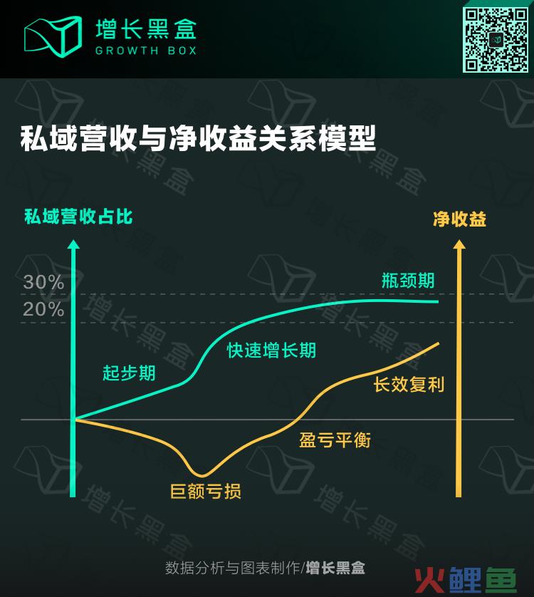 而伴随私域规模进入瓶颈期,模式逐渐稳定,边际成本降低,客户复购率、LTV也在提高。因此,净收益逐步提高,走向盈亏平衡并创造出长效的复利。