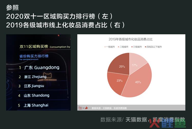 而跟2020年公域天猫双十一大盘相比,公域购买力Top5地区分别是广东、浙江、江苏、山东、上海。根据凯度数据,2019年化妆品线上消费占比同样有约60%来自一二线城市。公域私域之间还是有较多重合性。