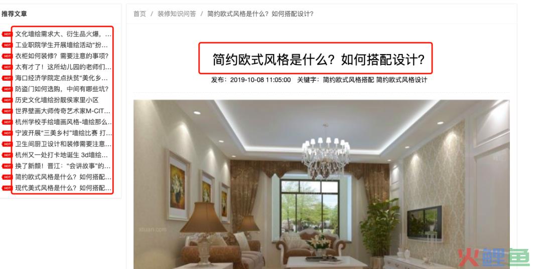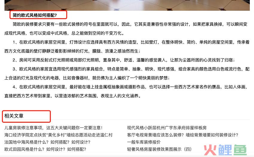 我们从上面3张图可以看到长尾关键词布局在页面标题中,比如简约欧式风格如何设计?以及推荐文章、相关文章的布局。