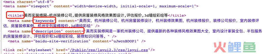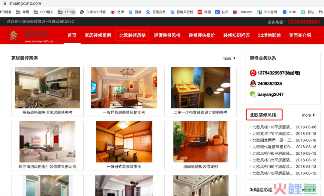 目标关键词主要布局在网站的三要素、网站各频道名字、网站底部、以及频道页里面各区块标题。具体以美而实装修网举例如下: