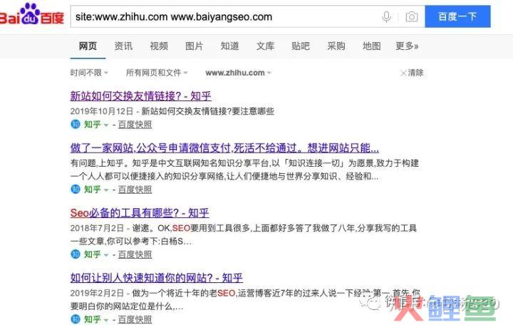 关于检测外链,可以用语法site:+网站 XXXX.COM 即可。这里网站可以放成任何指定的,那个XXX.COM也可以是品牌关键字。举例,比如我想看白杨SEO网站在知乎上的。即:site:zhihu.com baiyangseo.com,如图: