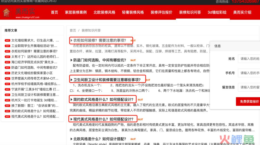 继续用上面这个美而实装修网站举例,本网站的长尾关键词主要布局在了装修知识问答中心。