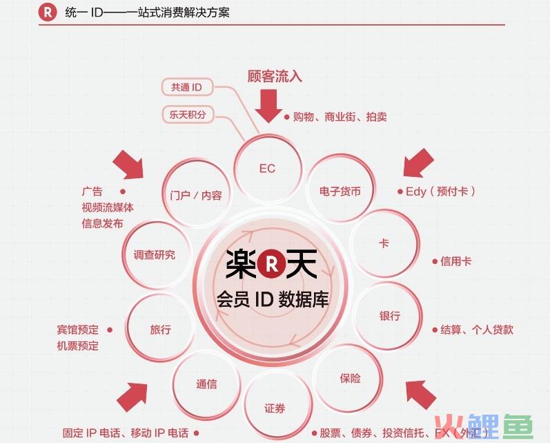 乐天以在线购物平台“乐天市场”起家,经历16年发展,目前除经营电子商务类网站之外,还拓展了电子货币、信用卡、银行、保险、证券、通信、旅行、调查研究、门户等业务领域。乐天每一块业务都使用统一的ID,并且共用底层的数据库。通过购物或使用乐天其他服务获得的“乐天超级积分”,可以在各业务中共通使用,积分在各种业务间流转形成良性循环。另外,乐天凭借对会员数据的分析,整合集团各种业务,使得各业务相互促进。乐天将自己的事业布局称为“乐天经济圈”,并且标榜其模式是世界上独一无二的且极难被模仿。