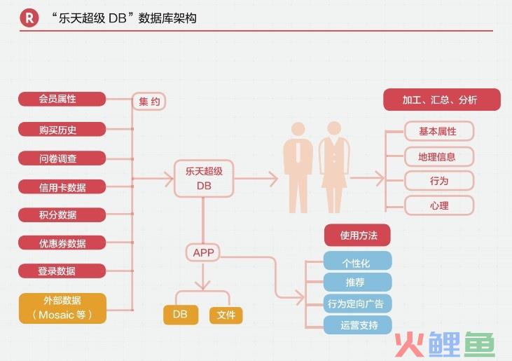 2012年乐天集团(含金融业务)的日本本土交易额达到4万亿日元。截止到2012年12月,乐天会员数达到8156万人,10个日本人里面有6个是乐天的会员,85%的日本网民是乐天的会员。会员通过一个ID可以使用乐天所有40余种服务,管理乐天的积分和优惠券。乐天积累的会员属性、商品信息、购买历史、购入金额、购买频次等各种数据已经极其庞大,而将巨大的数据通过统一ID打通、管理是乐天的优势。 整合了乐天40余种服务数据的数据库“乐天超级DB”,不仅可以存储数据,还会将数据按照会员的人口属性、地理信息、行为、心理属性等进行分析之后返回“乐天超级DB”,也就是说让生产数据和分析数据可以共存,然后数据库将分析出来的数据提供给乐天各种服务的APP。最初乐天数据库也不能自动进行数据分析,而是通过人工手动提取数据,在进行了各种实验达成一定效果之后实现了自动化。而后,通过工程师、运营、分析师反复的试验修正,不断提高自动分析数据的能力,并逐渐能够满足消费者个性化的需求。