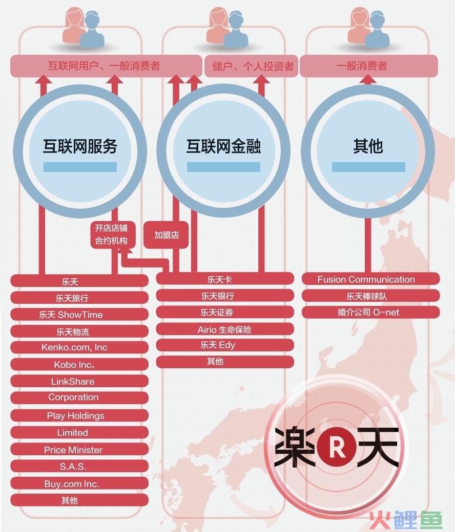 三大服务构建完整体系1997 年 2 月乐天成立,创始人是出身日本兴业银行的三木谷浩史。成立之初乐天想做的是网上假想的商业街,商业街的概念在于自己并不进货销售,而是给商家提供销售的场所和服务。这个商业街在日本叫“乐天市场”,与中国的天猫商城(原淘宝商城)模式大致相同。 2000年,成立仅三年的乐天成功上市,这为其日后的资产并购带来了大量资金。从2000年12月收购提供搜索服务的门户网站“Infoseek”开始,乐天不断通过投资收购扩大自己的经营范围,成为一家提供综合互联网服务的集团公司,业务涉及电子商务、电子货币、信用卡、银行、保险、证券、通信、旅行、调查研究、门户等众多领域。