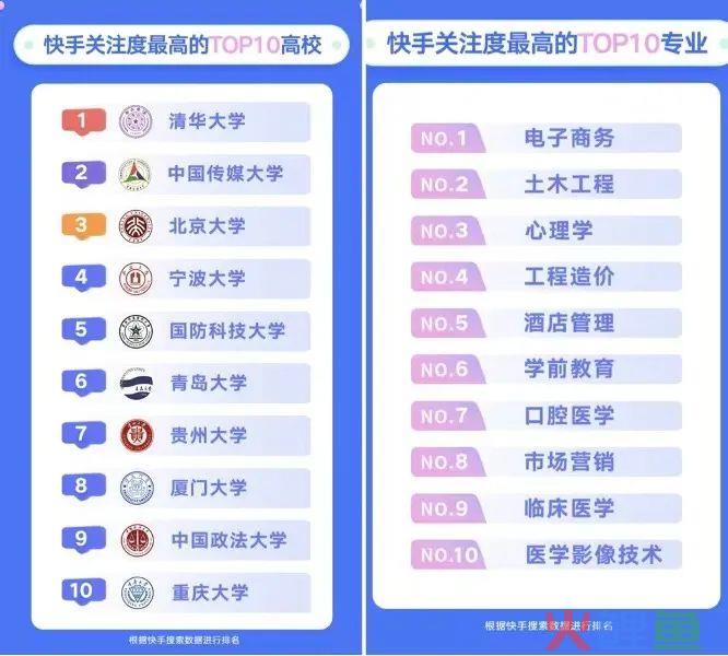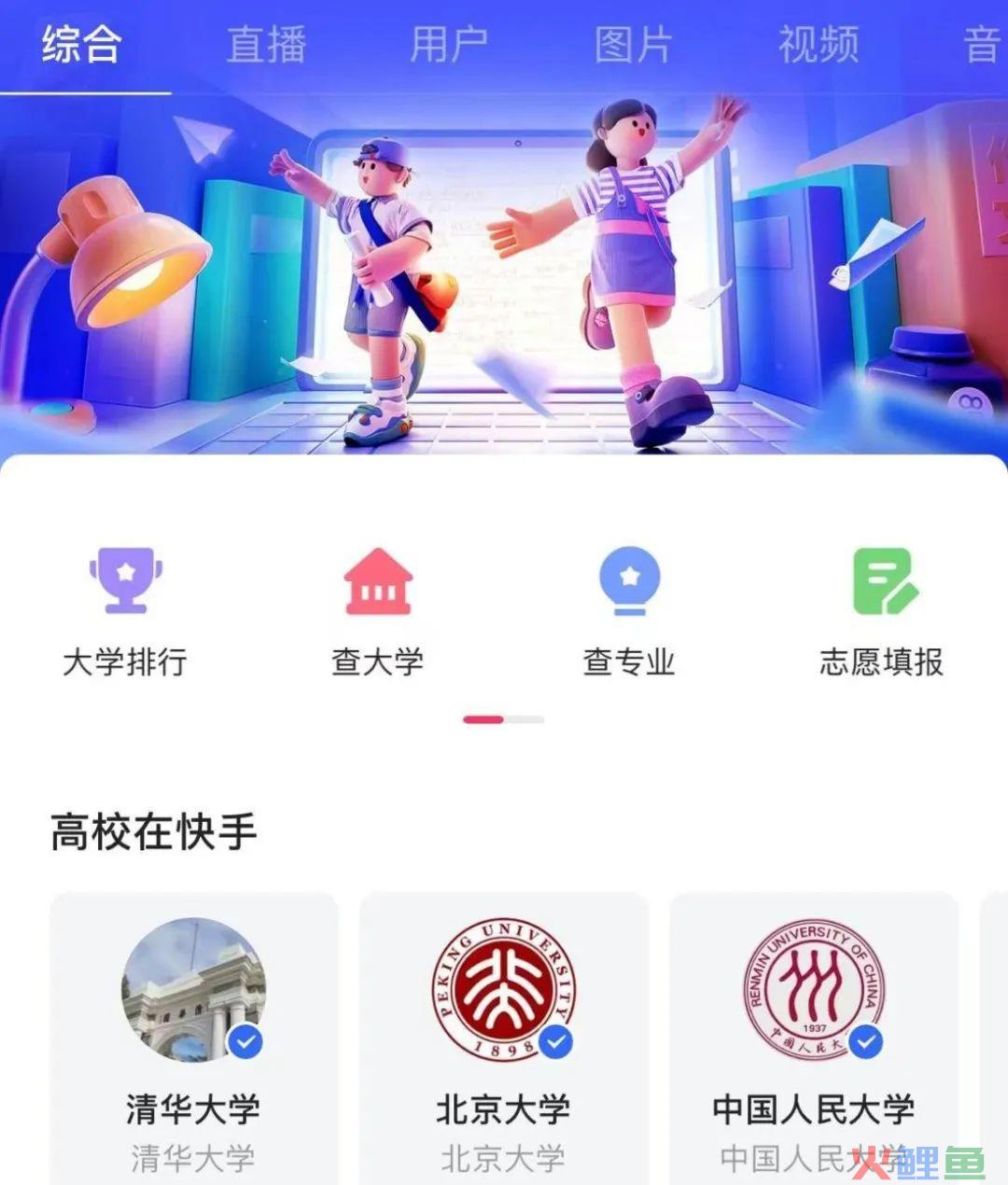 到了考后志愿填报阶段,快手官方还推出了高校百科查询工具,并联动了数百位教育大咖、泛知识垂类达人分享志愿填报经验。用户只需在搜索栏输入“高考”,就能进入平台专门设置的高考界面,这里有“大学排行”、“查大学”、“查专业”、“志愿填报”四个入口,考生和家长可以快速找到参考信息。