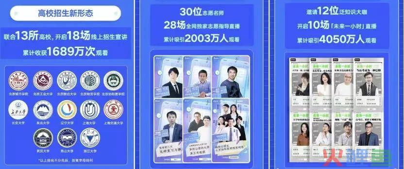 高考结束后,快手开启了“志愿大咖说”、“学长学姐逛校园”、“高校招生云宣讲”等系列直播,中国教育在线总编辑陈志文、中国高考规划行业联盟会长赵京、高考曲老师等50多位专业人士现身直播间。直播涉及教育专家、高校学长学姐、高校招生办等不同角度,考生家长在快手上可以获得更内部的视角,校准他们的判断。