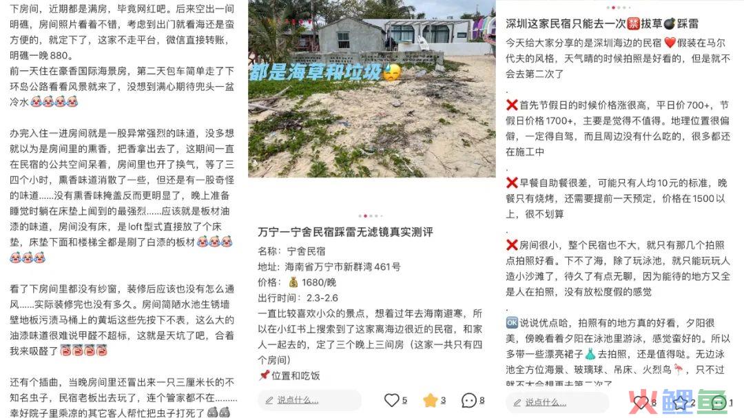 近两年来热度一直很高的万宁,也不乏有人“踩坑”。有人在小红书上发布“踩雷无滤镜真实测评”称,“价格为1680元一晚……房间内部的环境与宣传图片一致,但洗护用品都没更换……私密性非常差,人来人往……所有房间密码都一样,个人感觉非常不安全”并表示“没有什么服务可言,这个价格的民宿,服务很好的比比皆是,但是这里除了第一天老板帮着搬行李以外没什么服务了。”在这篇帖子的配图中,这间民宿外部环境并非“大海椰影,岁月静好”而是“海草与垃圾”。