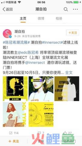 热点:不断制造热点,如潮自拍在近两个月参与“陈冠希潮流展”,并推出“innersect”滤镜;参与双十一单身狗的活动;