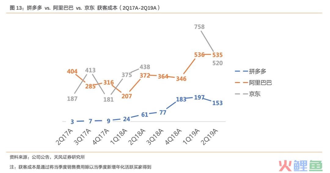 根据天风证券整理的数据表明,2019年Q2拼多多获客成本为153元/人,环比减少44元,而阿里获客成本为535元/人,京东为758元/人。
