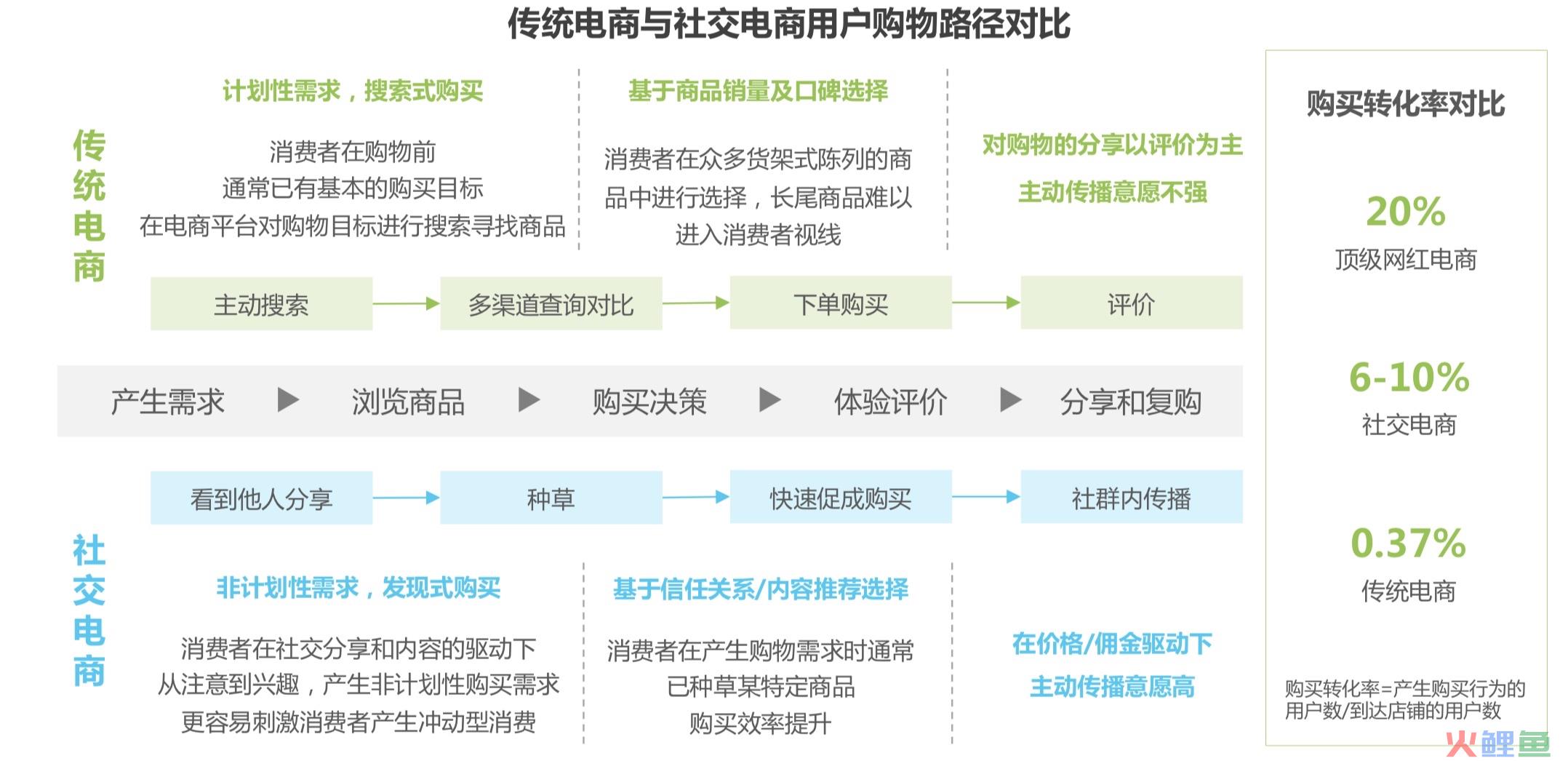 来源艾瑞咨询的数据表明,顶级网红电商的购物转化率高达20%,社交电商转化率6-10%,而传统电商仅为0.37%。 而社交电商高转化率还有一大原因是因为简化了购买门槛。几个关键词:小程序、去购物车和物品包邮,最终实现用户登陆首页到支付仅4个环节。