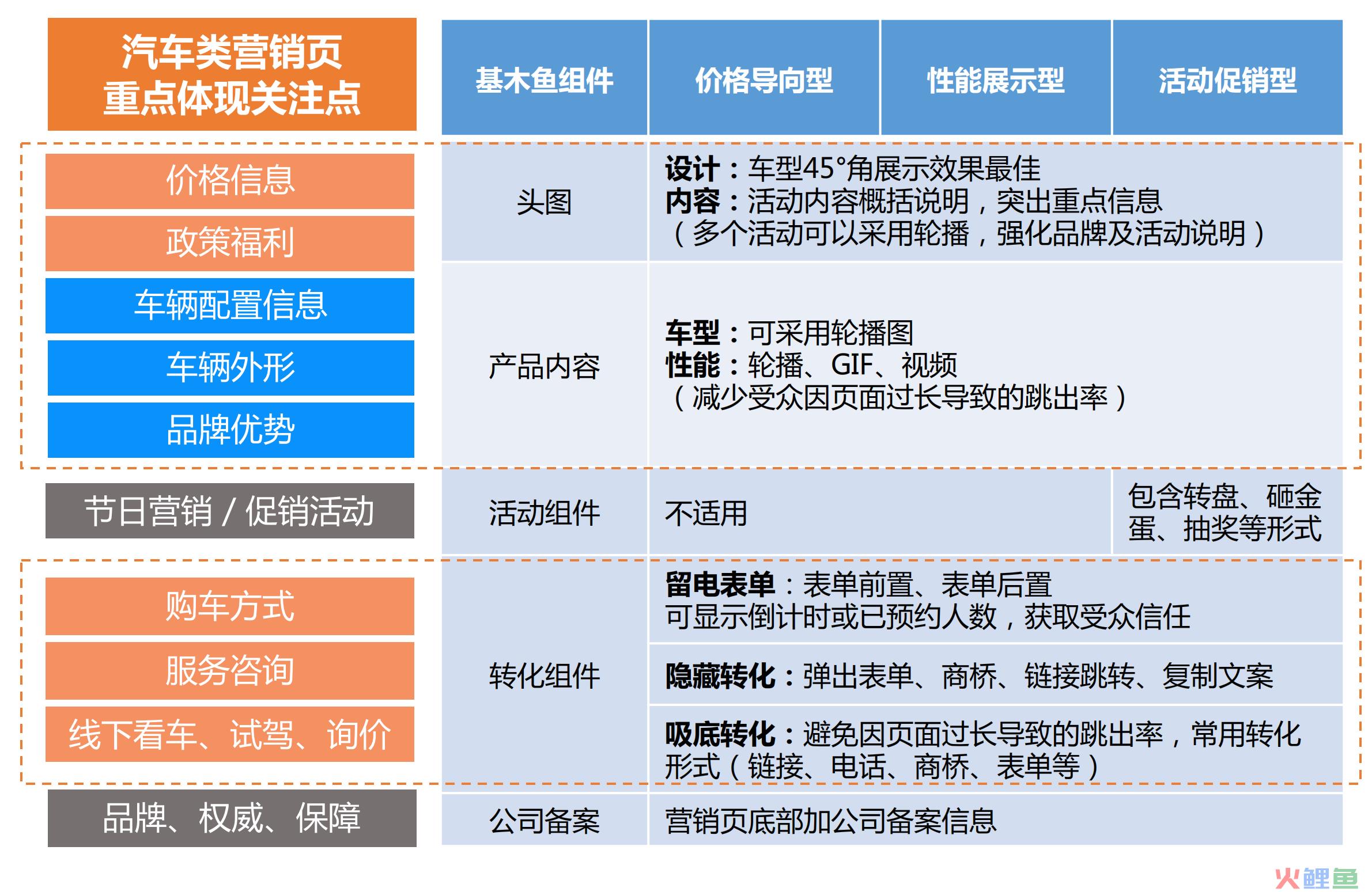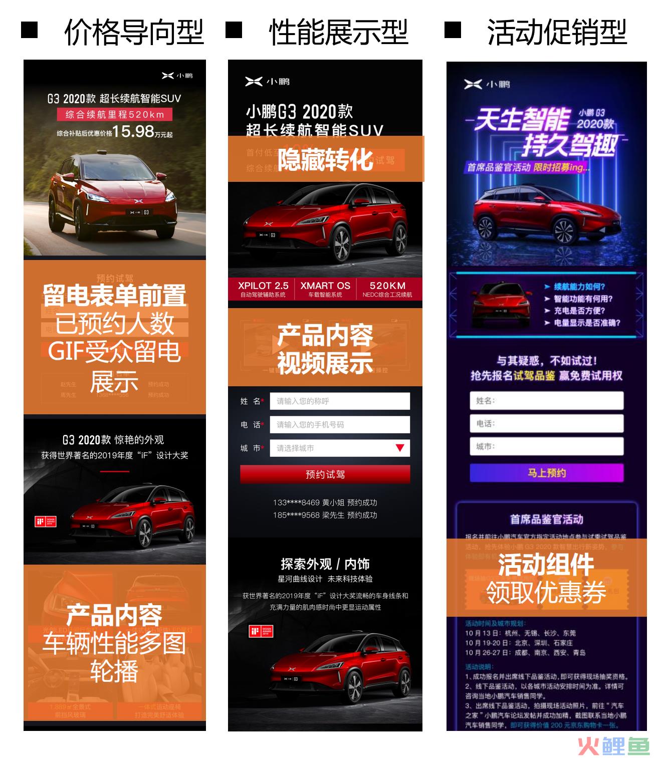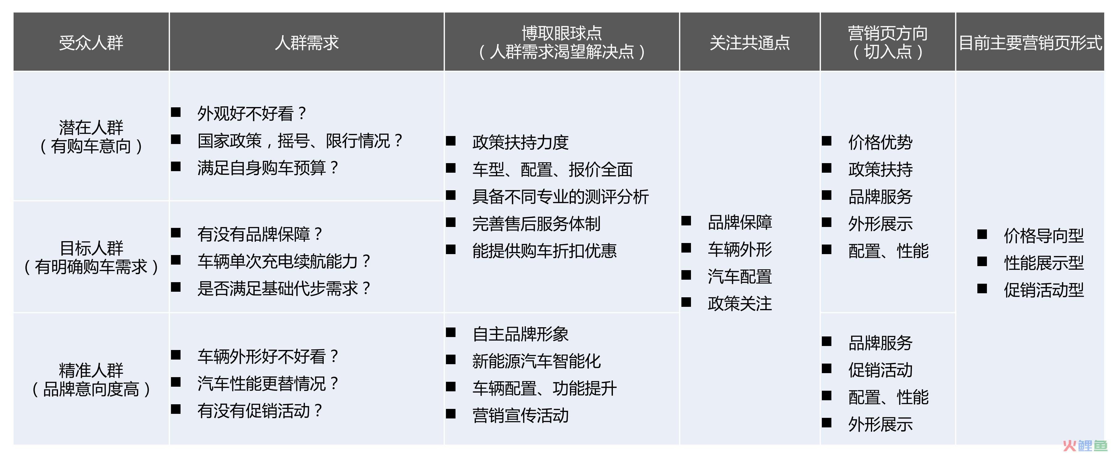 针对以上三类人群的需求,我们总结他们关注共同点包括是否有品牌保障、车辆外形美观程度、汽车配置、政策关注,并整理出主要的营销页形式。