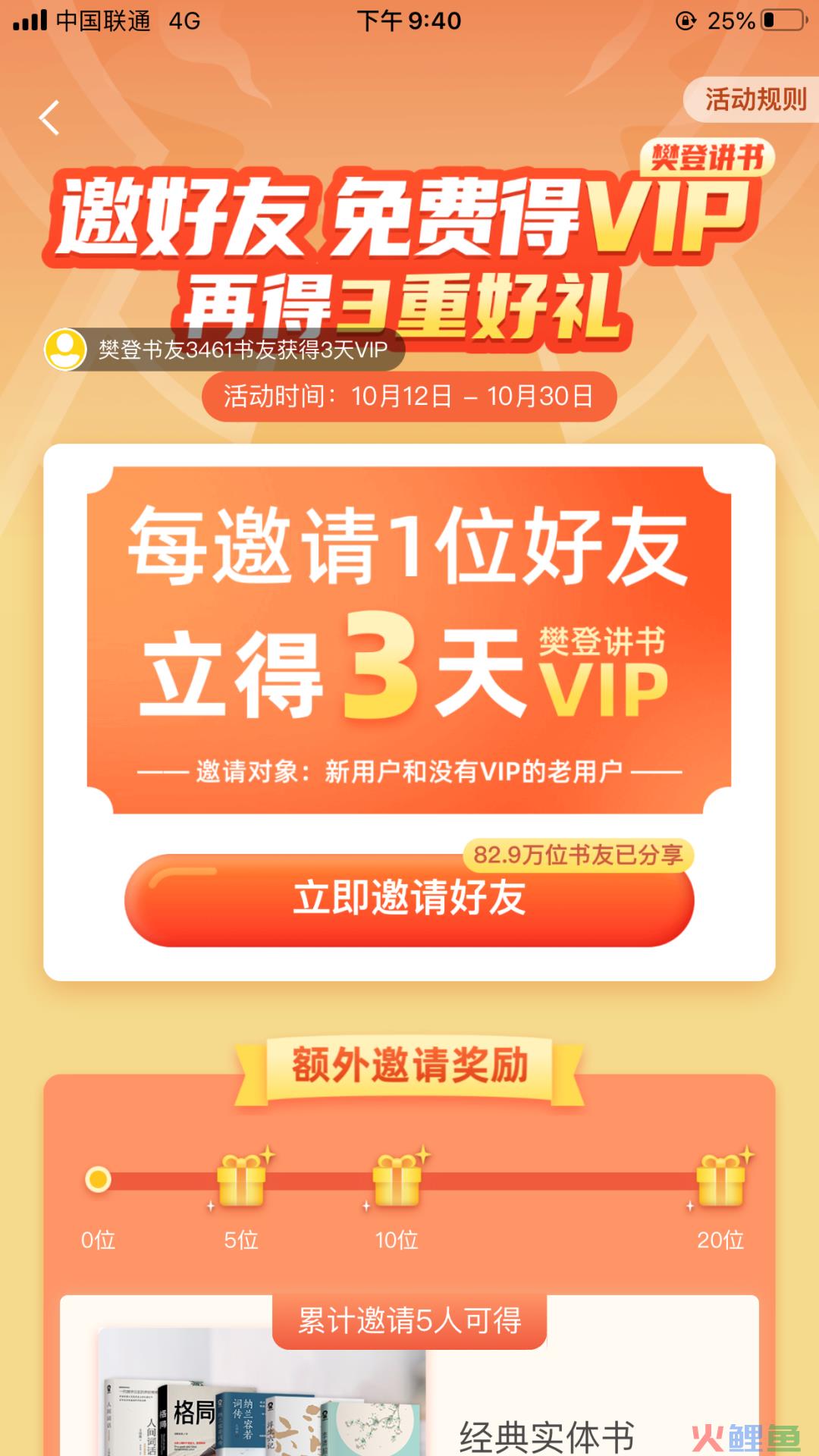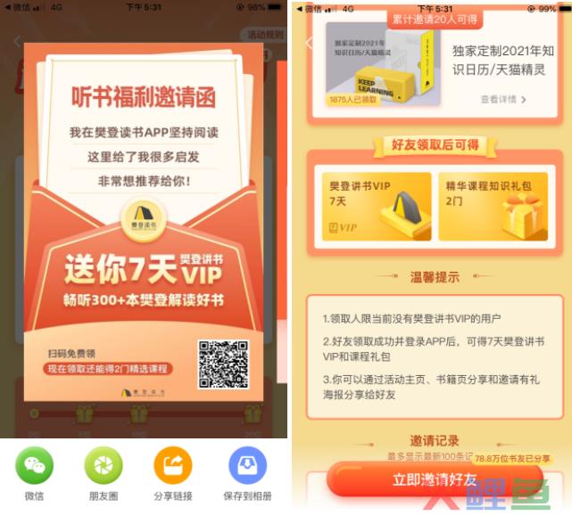 这个问题要从活动目标开始分析,这个活动的目标用户是非VIP用户,主要目的是让更多用户体验樊登读书的vip福利养成习惯从而转化普通用户为vip用户,并不是拉新,邀请新用户并没有额外的福利,并且邀请用户福利是vip的时间,所以对于已经是VIP用户来说意义并不大