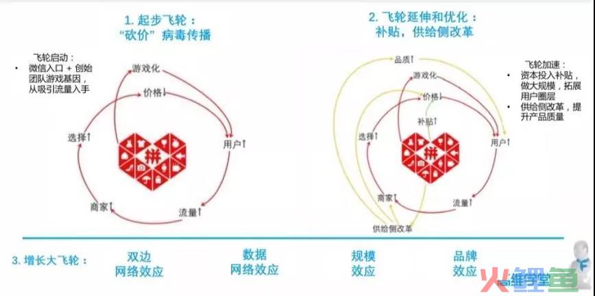 我们以拼多多为例来看下,它的起步飞轮由几个因素构成:一是微信的扶持,有微信的入口;二是创始团队有游戏基因,然后通过游戏化砍价进行病毒传播,最终形成起步的增长小飞轮。