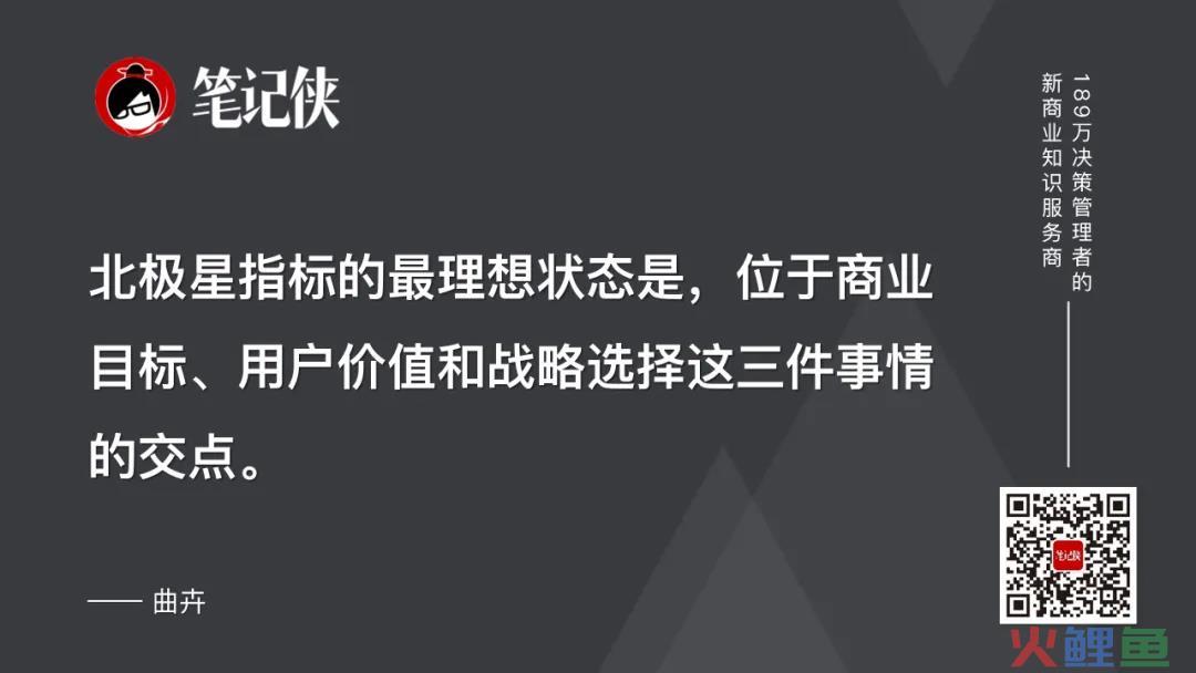 你们可以看出来,北极星指标的最理想状态是,位于商业目标、用户价值和战略选择这三件事情的交点。