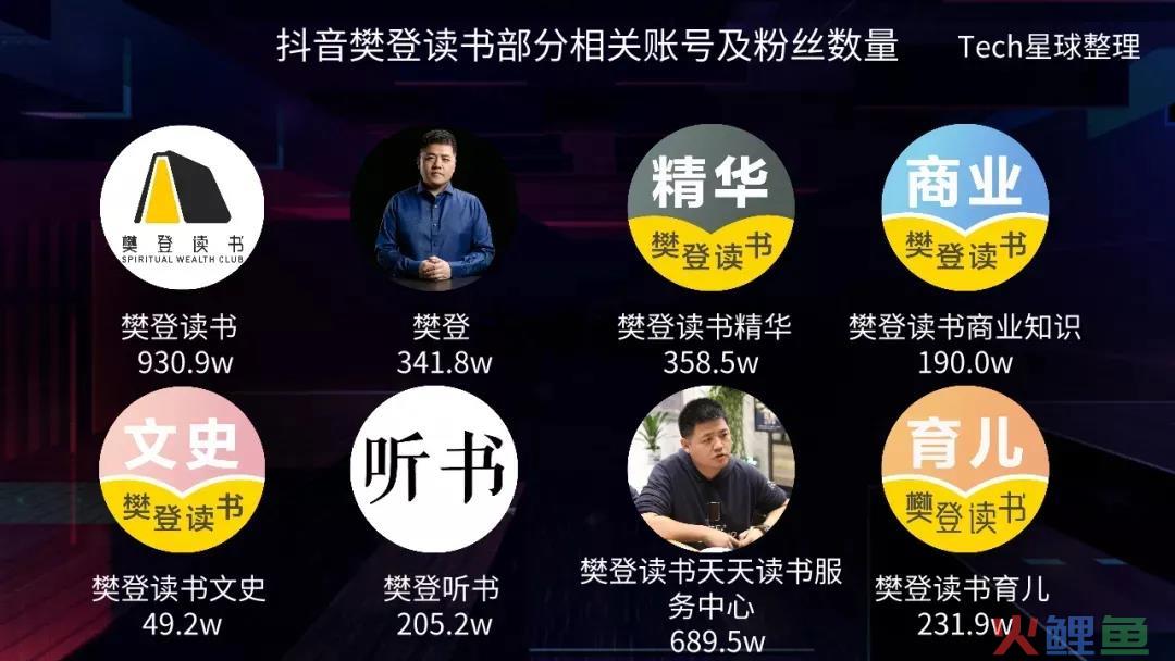 "得到"的抖音账号只有不到14万粉丝,吴晓波频道为277.6万粉丝,且仅有一个账号。但与此形成鲜明对比的是,樊登读书的抖音账号拥有930.9万粉丝,不止于此,还布局了强大的账号矩阵,矩阵粉丝量已过亿,百万粉丝的账号就有七个。