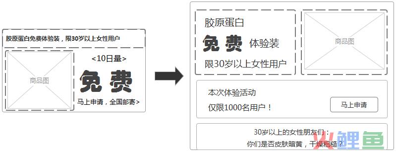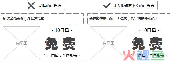 将“体验装”“样品”“试用装”经过AB测试,得出结论,转化率排序“样品”<“试用装”<“体验装”。“样品”给人一种廉价的感觉,而“体验”有种体验会员或者体验高级服务的感觉,尤其是女性顾客感触更深。在广告文案中,每个字都可能带来不同的转化效果。