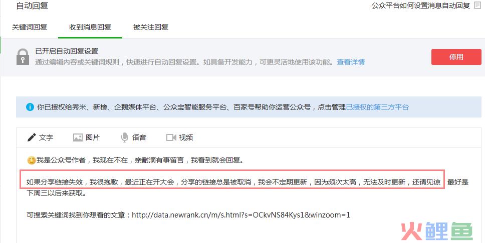 最后,我既然发现了用户流失其中的原因,就一定要想办法去减少这种被『被欺骗』的体验,所以我在消息回复里加了这么一句“如果分享链接失效,我很抱歉,最近正在开大会,分享的链接总是被取消,我会不定期更新,因为频次太高,无法及时更新,还请见谅,最好是下周三以后来获取。”
