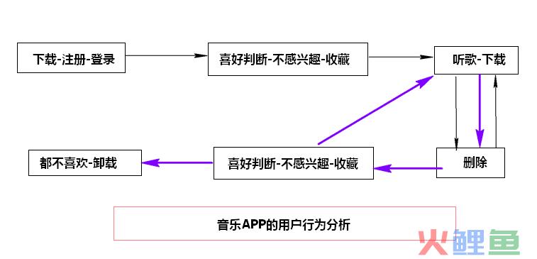 在我的认知里,一个音乐类APP的用户会经历下载、登录,然后在APP里进行喜好选择,之后是听歌,觉得好听会下载,但是人对音乐的喜好会随着时间而变化的,所以下载和删除是不断相互交互的,一旦用户找不到自己喜欢的音乐了,就对产品失去兴趣了,进而就会卸载。其中具体到哪一些行为可以认为是活跃用户,我认为在听歌和删除之间交互的用户就是活跃用户、如果用户不断删除和进行喜好筛选就要警惕用户可能流失。