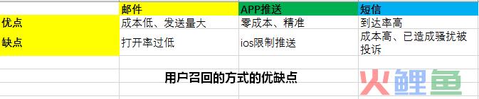 召回的用户要像新用户一样对待,就像和朋友重新认识一样,先不说后话,先看如何进行召回吧。目前我所遇到的召回方式还是这三种『邮件-EDM营销』、『短信营销』、『APP端push』等。它们各有各的优缺点,一般是三种方式结合起来使用,对不同的用户采用不同的策略组合。无论采用什么方式,最终我们还是要落实到数据上,即触达内容的到达率、打开率、链接跳转至APP下载页面(web页)的转化率等,通过数据去衡量内容文案以及渠道的实效性。