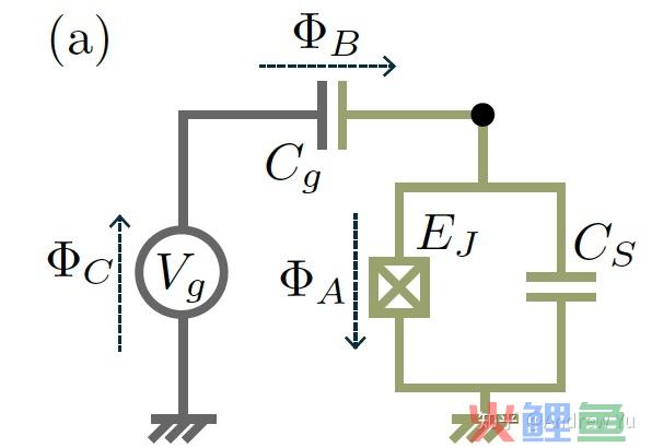 另一种常见的耦合系统是一个约瑟夫森结与电容 C_S 并联,然后经过 C_g 与另一个LC电路耦合,电路见下图(部分电路元件没有标出,我也不晓得review里面为什么不标)