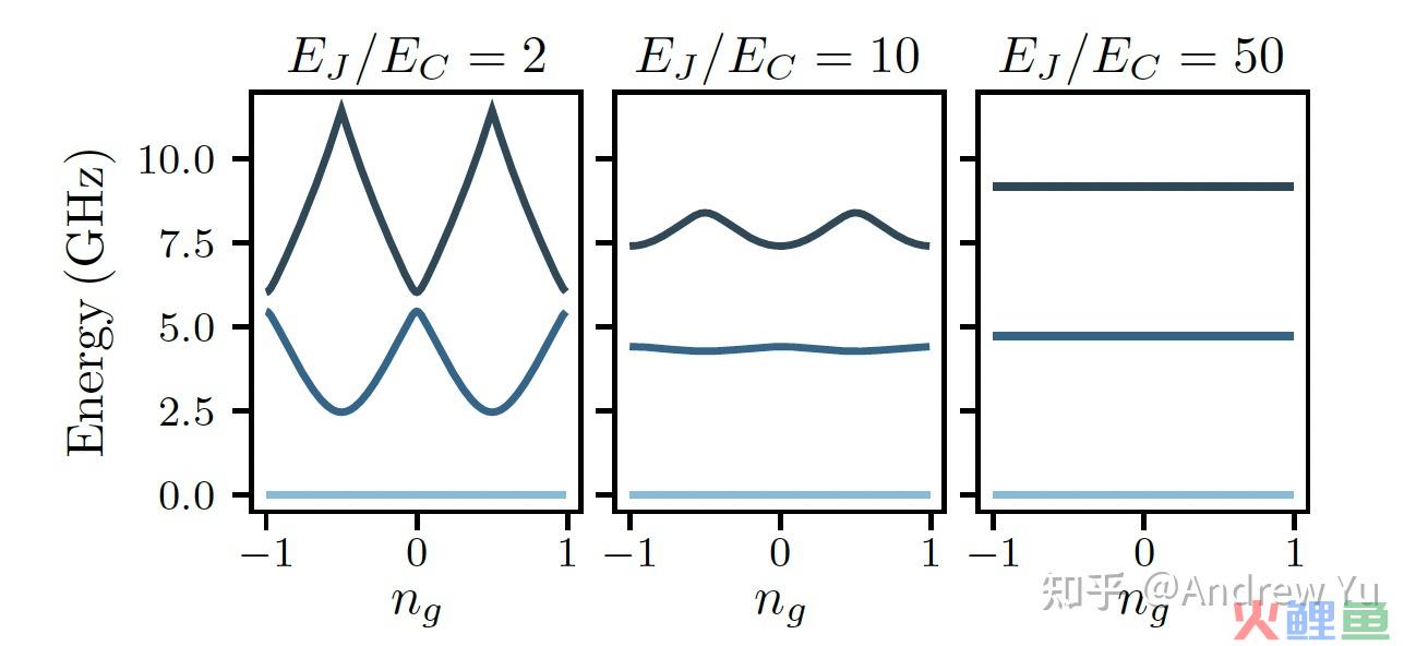 按照制造出来的qubit的 E_J/E_C 的数值,我们可以将超导比特分为几类,其中比力常见的有Charge qubit,其 E_J/E_C\approx1\sim10 ,还有Transmon,其 E_J/E_C\approx50\sim80 。为什么要依照这类比值分类呢?主如果为了避免耦合致使的电荷涨落发生退相关。超导比特和外界电磁场发生的形式会在哈密顿量中增加一个 n_g项,而当外界有电荷涨落时,对应的超导比特中的耦合电荷也会发生涨落,从而致使其能级发生移动。由于涨落是随机的,在这一进程中系统的相位也会随机波动,终极致使退相关。从哈密顿量中可以看出这一电荷涨落影响的是电容能量部分,是以假如我们将电容增大,从而减小 E_C ,虽然这样 \hat{n} 的涨落会增大,可是 n_g 与超导比特的电容无关,只与外电路和耦合电容有关,是以 n_g 涨落带来的总能量改变就会获得抑制,从而削弱退相关。下图展现了分歧比值下系统能级对耦合电荷涨落的响应,可以发现Transmon(最右侧)几近不受影响,对应的就不轻易退相关。固然,这也是有价格的,而价格就是会致使超导比特作为一个非简谐振子的非简谐性anharmonicity(简单来说就是能级之间能量差的不均一性)削弱,不外这一下降在可接管范围内。这也就是为什么现在做量子计较的几近都是用Transmon。