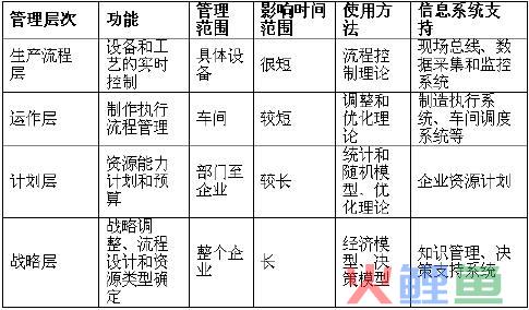 业务流程(也叫做经营流程)是为了实现一定的经营目的而执行的一系列逻辑相关的活动的集合,业务流程的输出是满足市场需要的产品或服务。根据功能、管理范围等的不同,企业的流程管理一般分为生产流程层、运作层、计划层和战略层四个层次。图1对各个层次做了比较。