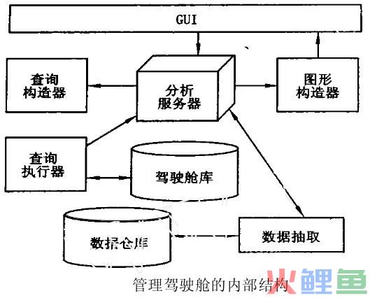 参考了Mehmet等提出的业务过程驾驶舱的结构,提出了管理驾驶舱的内部结构。如下图所示,GUI是图形用户接口把用户的需求传给分析服务器,分析服务器是整个管理驾驶舱的核心,它负责把用户的查询需求传给查询构造器,查询构造器根据用户的查询需求生成查询语句,并把这个查询语句交给查询执行器。查询执行器在驾驶舱库执行查询,并把查询的结果交给分析服务器。分析服务器再把这个结构传递给图形构造器,最后图形构造器以适当的形式显示给用户。