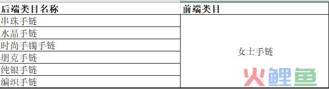鉴于以上我说的比较虚,那么还是给大家上图可能领会的更加真切一点。拿女士手链举例,一般消费者看类目只会看女士手链,而后台的商品则能仅仅以女士手链这一个维度来分类,这样更加便于商品的维护与整理。往往一个前端类目会有一个或者多个后端类目映射而来,而这个前端类目则是后端类目的代言人。