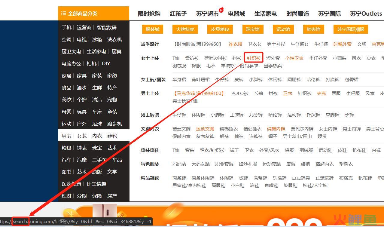 看下图,链接以search开头的就是挂靠的搜索链接,点击针织衫后会直接跳转到搜索结果页,如果是list开头的则是挂靠的列表链接。