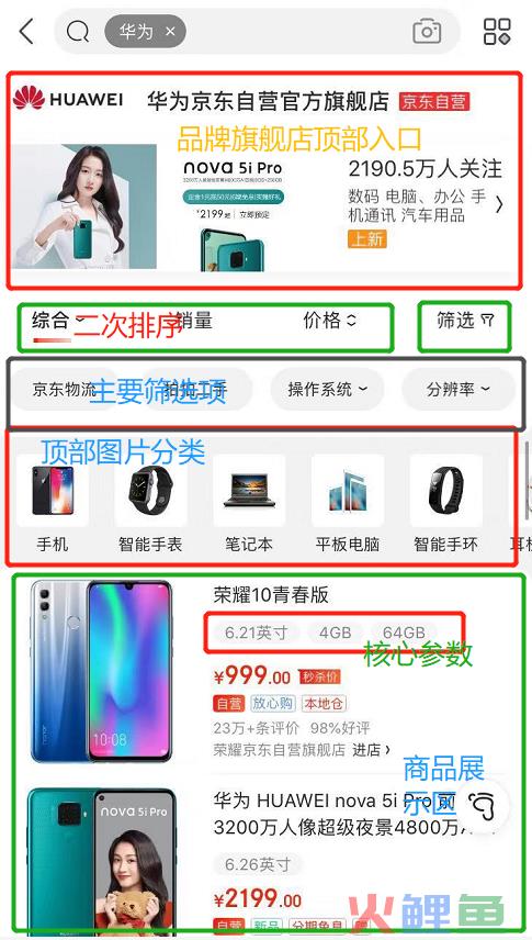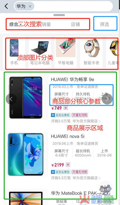 两者都包含有共同的区域,除去商品展示区域外,都包含二次排序、顶部分类、商品核心参数。由于天猫的顶部店铺旗舰店需要手指向下滑动会以大屏幕展示,所以此处并没有截全。