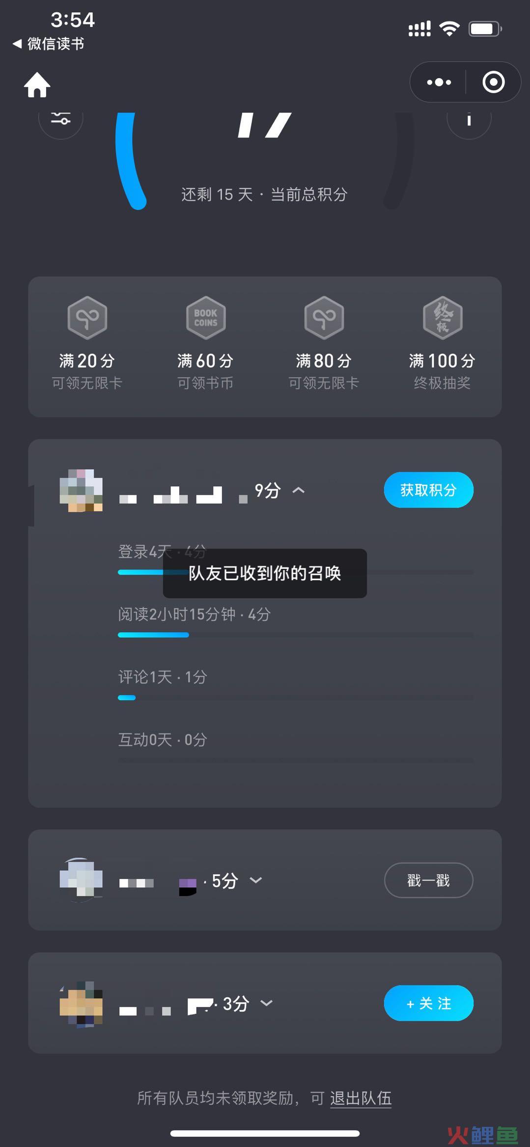比如微信读书的读书小队,用户组团后一起读书、互动攒积分,而团队的积分到达对应门槛得对应奖励。