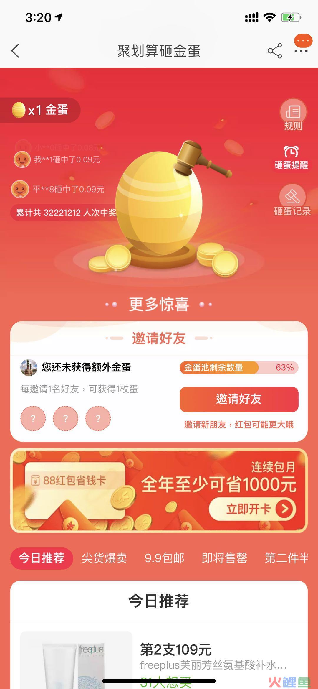 聚划算的砸金蛋活动,则在小处体现了限量概念,例如每天可砸的金蛋有限,金蛋池的剩余数量肉眼可见的减少,用户为了薅这个眼看着就要被别人薅完的羊毛,就会去邀请好友一起砸蛋。