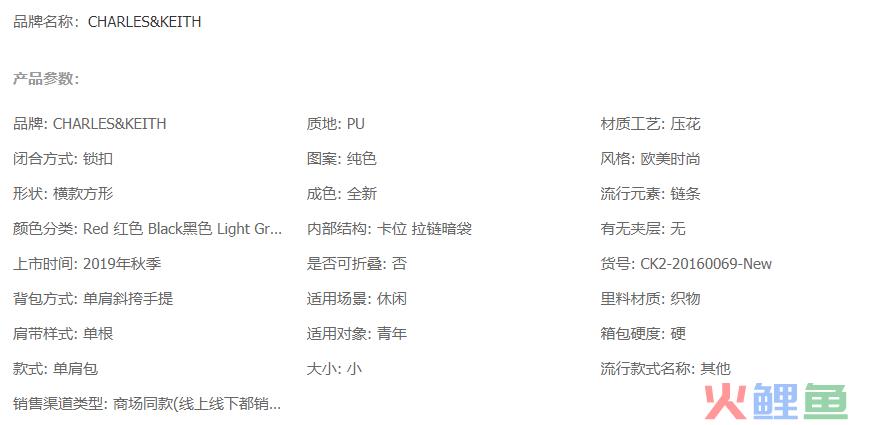 女包里面不同的参数项里面会包含有不同的参数值,每个行业都有其独特的生产与设计标准,箱包类也一样,其造型和设计可以分为若干,比如形状 / 材质 / 流行元素 / 内部结构 / 硬度 / 里料材质,是否可以折叠等等一系列的参数项。