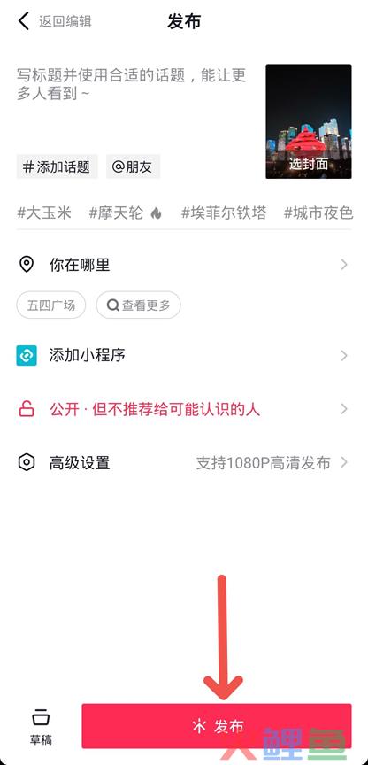 当您完成上个步骤后,就可以实行最后一步了。当您完成视频的编辑内容后,点击下一步就会出现视频发布的页面。您可以在视频发布页面内,编辑视频的标题或添加热门话题,以让更多对视频感兴趣的人看到。同时可以添加您的地理位置,方便同城的人更容易刷到您的视频。在点击发布后,您的视频就发布在抖音短视频APP上了。